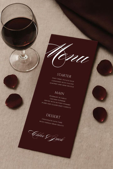 Non utilizzo modelli standard: ogni menù matrimonio è progettato su misura per mantenere coerenza con l’intero progetto wedding.